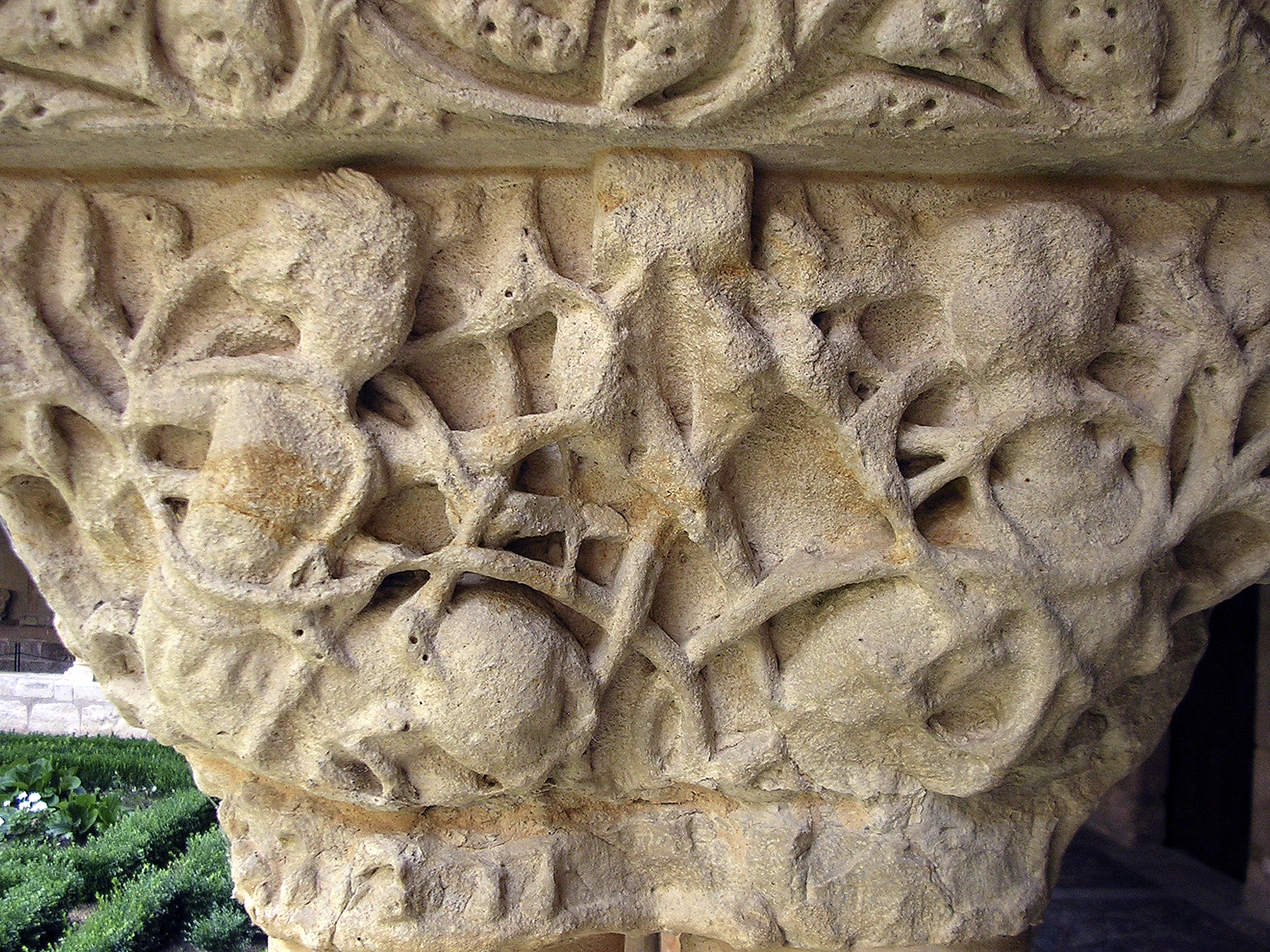 La temática vegetal del claustro, propiamente dicha, se inicia en capiteles de tallos entrelazados que expanden y enroscan palmetas crecidas a partir de un botón inicial. Los tallos, a su vez, surgen de unas hojas pinnadas y festoneadas, posadas en el astrágalo, de tamaños distintos; aunque, al mismo tiempo, broten de las fauces de unos mascarones pegados al ábaco.