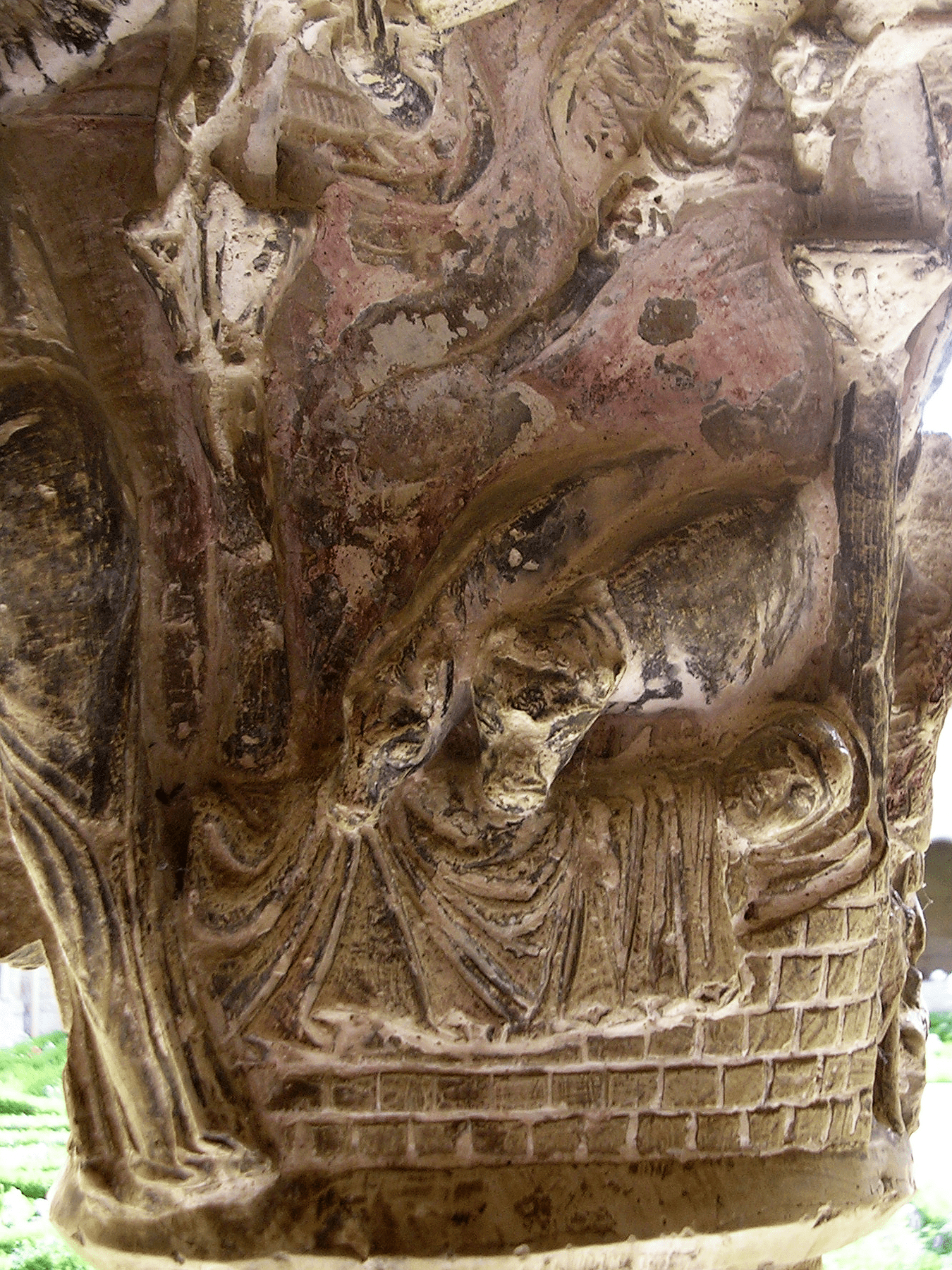 En este capitel, también muy destruido, por primera y única vez, aparece la figura humana integrada en el bestiario. Entremezclada con la fronda, surge en forma de pequeños personajes, dinámicos y en posturas dispares, que atacan y a la par se defienden de dragones situados a sus pies.