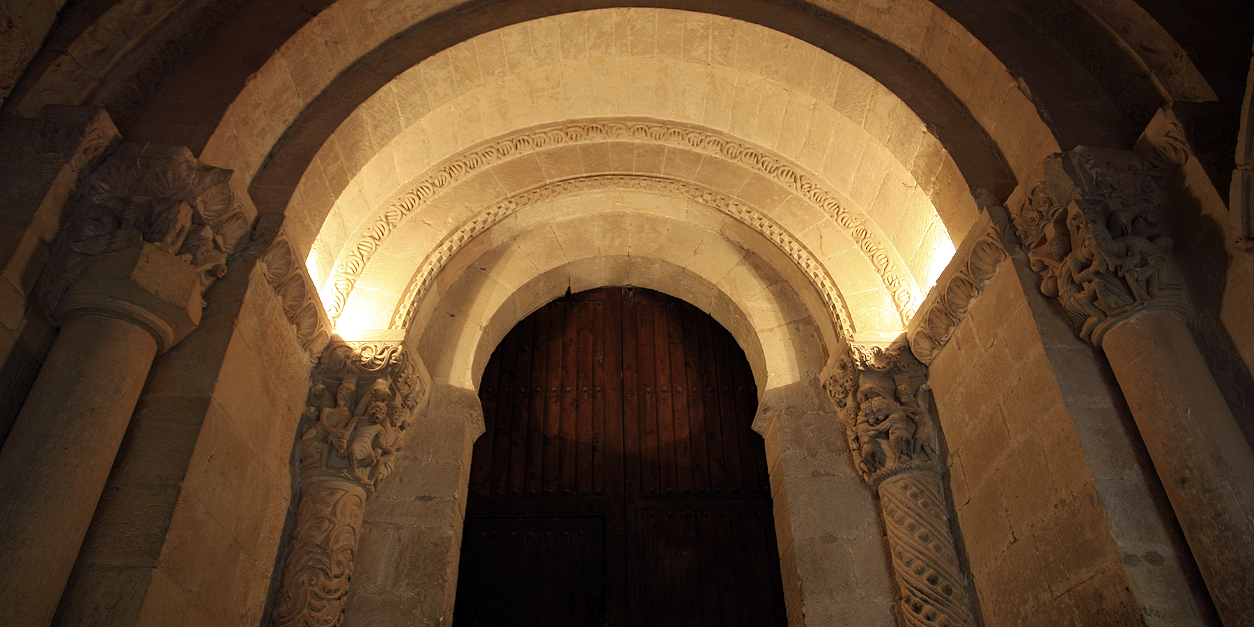 El conjunto es un espacio abovedado, con una anchura de más de dos metros y acceso escalonado. El vano interior de acceso tiene forma de herradura al prolongarse la rosca del arco de medio punto con impostas. La bóveda descansa sobre dos columnas a cada lado. Las exteriores de fuste monolítico liso y las interiores decoradas, la izquierda con escamas y la derecha con una espiral con bolas en su interior. Los capiteles contienen temas figurativos, el exterior izquierdo, conservado parcialmente, contiene cabezas humanas con alas, el derecho está formado por dos personajes arrodillados en cada uno de sus lados, compartiendo cabeza, pasando uno de sus brazos por la espalda de su compañero y mesándose la barba dividida en dos mechones. Los capiteles interiores están tallados en su lado izquierdo con una figura en el ángulo sujetado por un personaje a cada lado que pudiera representar a guerreros, el derecho con dos leones erguidos y abrazados en el ángulo del capitel sujetados por cuerdas por dos figuras humanas. La singularidad de estas representaciones iconográficas y su estilo pueden enmarcarse entre los años 1120 y 1130, momento en el que se ha datado la construcción del transepto.