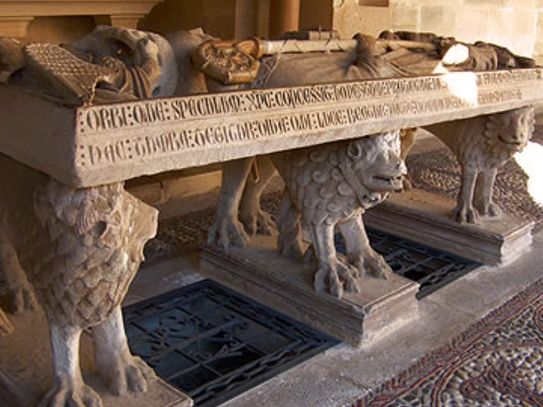 Esta lápida, que señala el primitivo lugar del sepulcro del santo, realizada en el siglo XIII-XIV, está colocada en la crujía norte del claustro. Representa al santo yacente con báculo y libro en sus manos. Se apoya sobre tres figuras de leones. Una reja situada en el suelo instalada en 1954 permite observar una tumba antropomorfa.