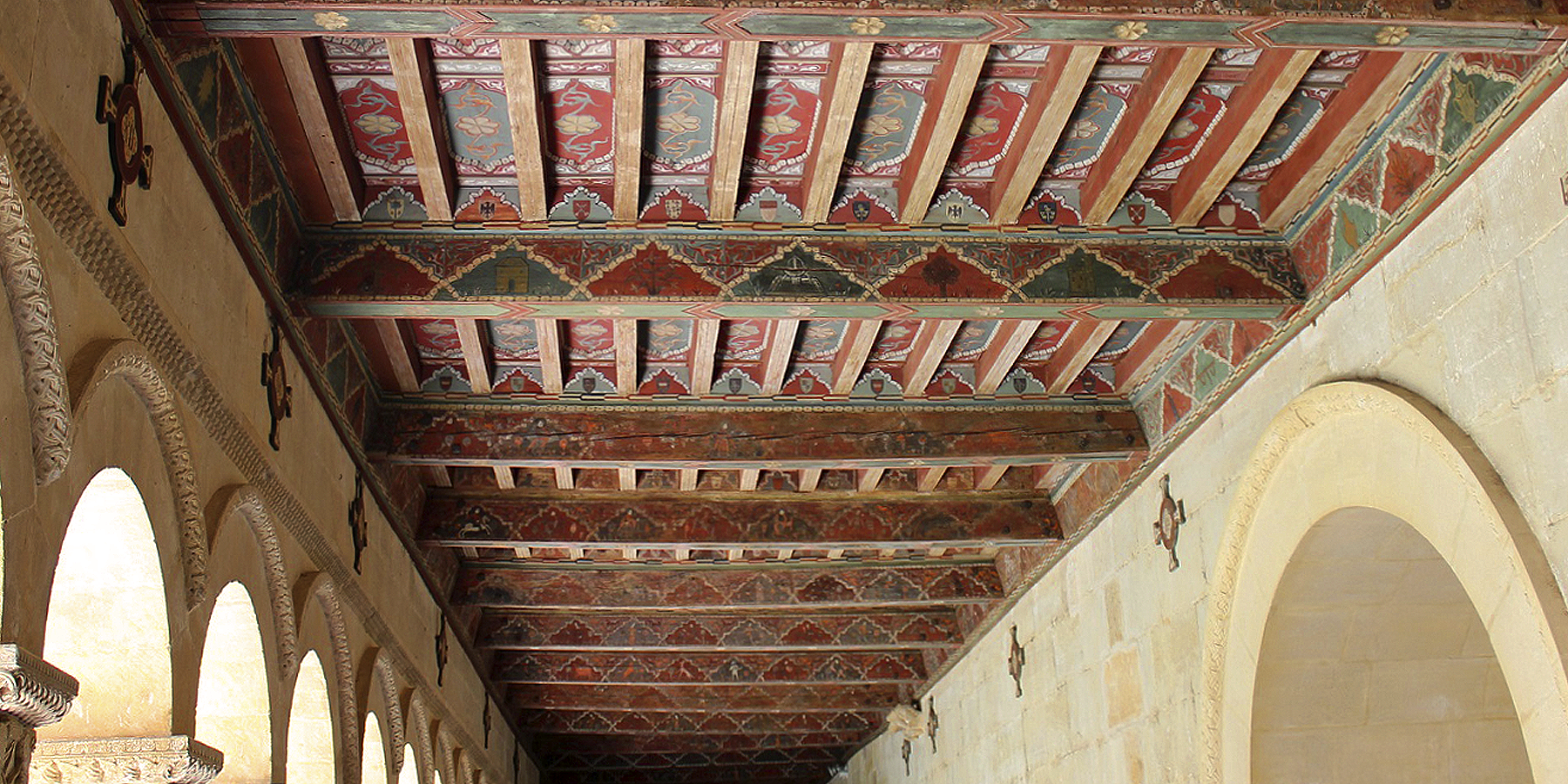 El claustro bajo del monasterio está cubierto con un techo de madera plana que se denomina alfarje con su estructura a la vista. Está formada por una sucesión de vigas maestras o jácenas, que apoyan en el muro interno y en la panda exterior del claustro, y vigas transversales o jaldetas, de menor escuadría, entre las que se colocan tablazones de madera. Toda la estructura en Silos está pintada y algunas partes están también labradas con motivos geométricos (cara inferior de las vigas y tablazón). Las escenas pintadas que recubren las vigas principales, las tabicas (tablas situadas entre los huecos que dejan las vías al entrecruzarse), las tablazones que hay por encima de ellas y los de unión con los muros constituyen todo un catálogo de más de seiscientas representaciones de temas religiosos y profanos, predominando estos últimos con escenas de la vida cotidiana, temas caballerescos y temas amorosos. Se ha considerado que la fuente para la realización de estas escenas posiblemente sea el Libro de Buen Amor o Libro de los Cantares del Arcipreste de Hita -escrito h. 1330-1343-, que contiene una amplia colección de narraciones y composiciones poéticas: fábulas, ejemplos y moralejas, alegorías, cantares, cantigas de ciegos, poemas líricos profanos y religiosos.