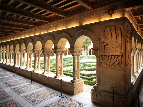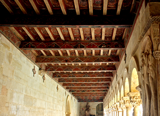 Además de los capiteles y altorrelieves de las esquinas, en el claustro debe destacarse el alfarje del siglo XIV, realizado en pino y pintado en toda su superficie, que hoy se puede ver en las galerías oeste y sur y parte de la norte, mientras que el resto es obra de finales del siglo XIX, cuando se restableció la comunidad monástica. Es posible que la parte antigua se construyera después del incendio ocurrido en 1384. Su estilo es gótico-mudéjar y la iconografía se sirvió de motivos variados de carácter religioso, sobre caballeros, el amor o profanos.