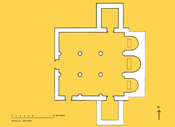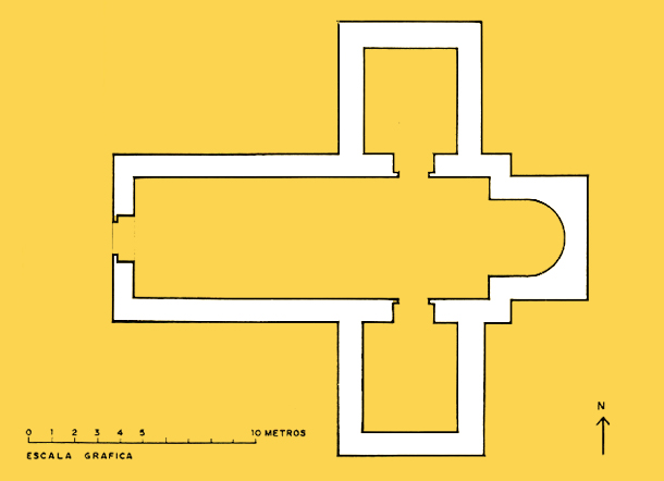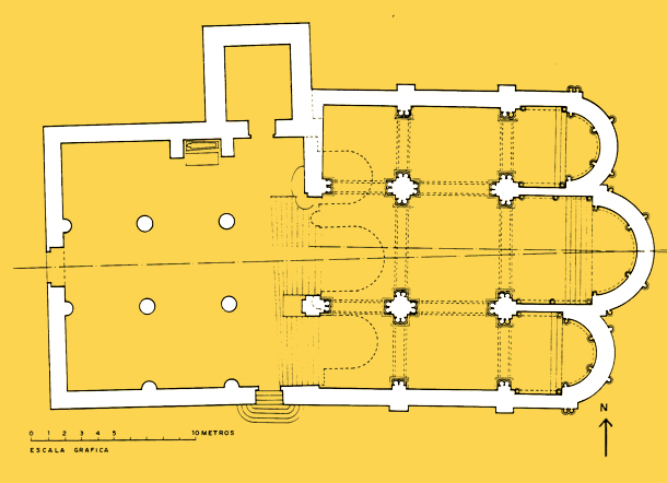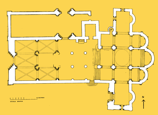 El primer templo parece que contaba con una única nave con cabecera cuadrada, que se amplió en tiempos del abad Domingo, convirtiéndose en un edificio de tres naves y cabecera con tres ábsides semicirculares. Unos años después, en tiempos del abad Fortunio, se realizó el templo que finalmente se consagró en 1088, con tres naves separadas por pilares cruciformes, y tres ábsides en la cabecera. Sus características eran similares a las de otros templos contemporáneos como el de San Pedro de Arlanza, San Facundo, San Isidoro de León y San Primitivo de Sahagún. Se le añadió después el crucero donde se abrió la Puerta de las Vírgenes, que permite el paso desde la iglesia al claustro. También son de este momento las portadas sur y norte del templo. La septentrional conserva el tímpano donde se representaba la Presentación en el templo, la Natividad y la Adoración, que en la actualidad puede verse en el museo del monasterio.