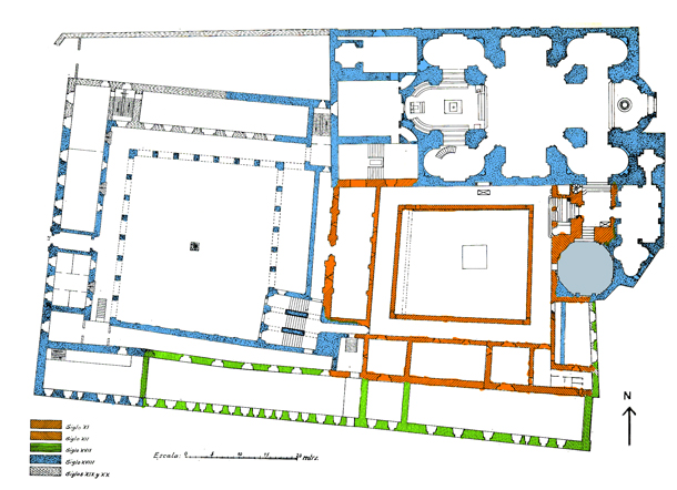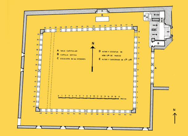 En la panda este se localiza la Sala Capitular y el scriptorium; en la sur, están la cocina y el comedor en el primer piso, del que solo se conserva un arco, y el dormitorio estaría en la segunda planta; y en la occidental se localizaba la hospedería ocupando las dos plantas. En las esculturas de los capiteles y de las esquinas, se han distinguido tres talleres.